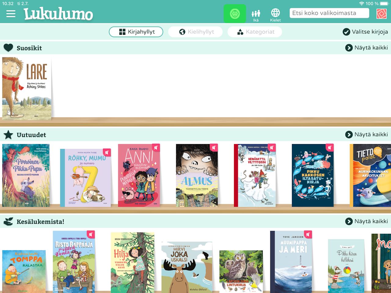 Voit myös laittaa lapsitilan päälle yksittäisestä kirjasta. Kirjan tietosivulta, joka avautuu, kun kosketat kirjan kantta, voit valita lapsisymbolin.