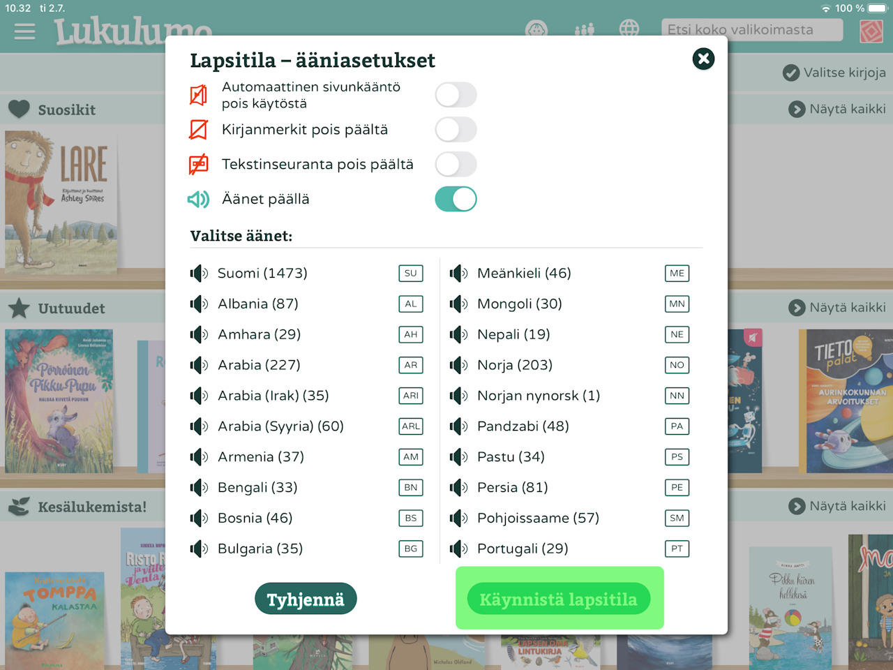 Tällöin lapsitilan kirja-asetukset aukeavat ja voit asettaa rajoittimet.