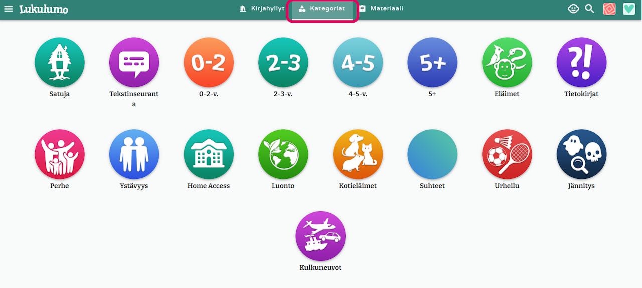 Pääset kategorioihin valitsemalla ”Kategoriat” ruudun yläreunasta. Kun olet valinnut kategorian, kategoriaan kuuluvat kirjat näkyvät sivun alalaidassa. Voit myös etsiä kategorioita etsintätoiminnon avulla.