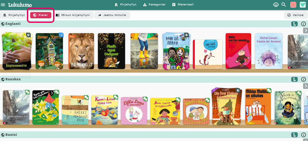 Jos avaa kirjan lapsitilassa (toiminto saatavilla vain Lukulumon varhaiskasvatusversiossa), on oletusasetuksena valittu kieli ja suomi, jolloin lapsi ei pääse vaihtamaan kieltä, vaan keskittyy juuri näihin kahteen kieleen. Voit lisätä saatavilla olevia kieliä asetuksissa.