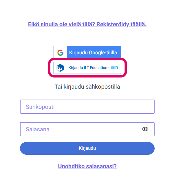 Kirjautuessasi ILT Educationilta saamillasi tunnuksilla, klikkaa "Kirjaudu ILT Education tilillä" (kolmas kuva)