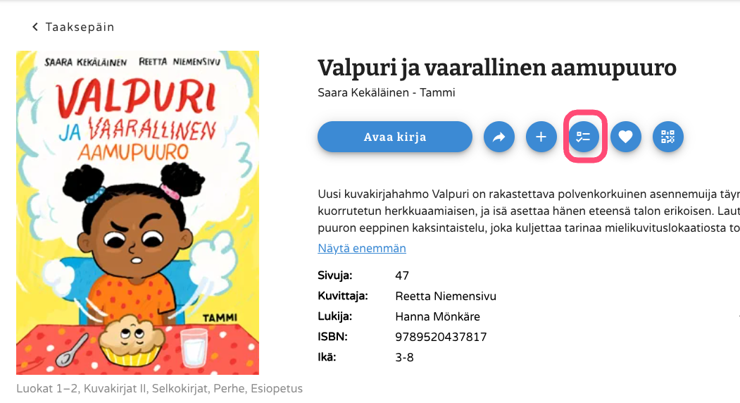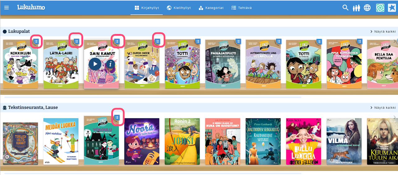 Tunnistat luetunymmärtämistehtäviä sisältävät kirjat oikean yläkulman sinisestä symbolista. Pääset katsomaan tehtävät avaamalla kirjan info -sivun (sovelluksessa: klikkaa kirjan kantta, selaimella: vie hiiren osoitin kirjan kannen päälle ja paina näkyviin tulevaa i -painiketta) ja klikkaamalla sieltä tehtävät -ikonia.