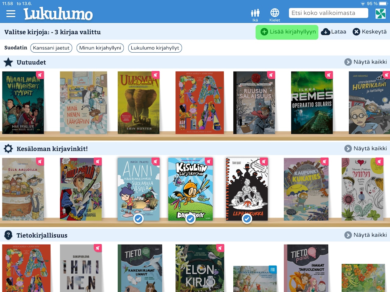 Kun olet valinnut haluamasi kirjat, klikkaa oikealta yläpaneelista "+ Lisää kirjahyllyyn".