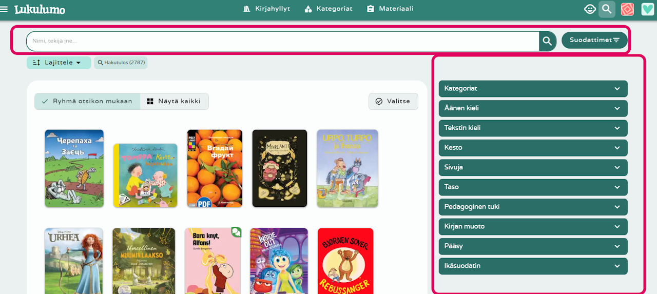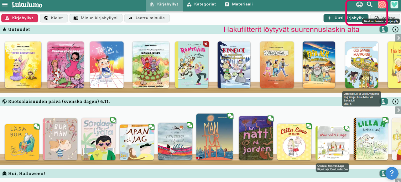 Jos haluat etsiä Lukulumosta esimerkiksi tiettyä kirjaa tai kirjailijaa, kirjoita hakusanasi yläreunan hakukenttään. Hakusana voi olla kirjan nimi, kirjailija, kuvittaja, julkaisija, kategoria, kirjahylly tai kirjan avainsana.