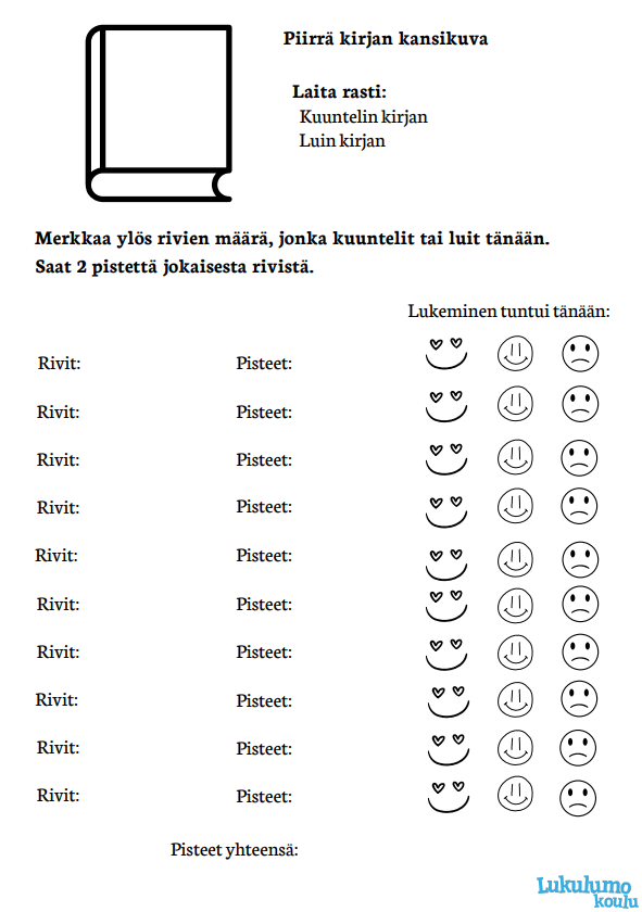 Oppilaalle "Piirrä lukemasi kirjankansi ja seuraa lukumäärää" -tehtävä
