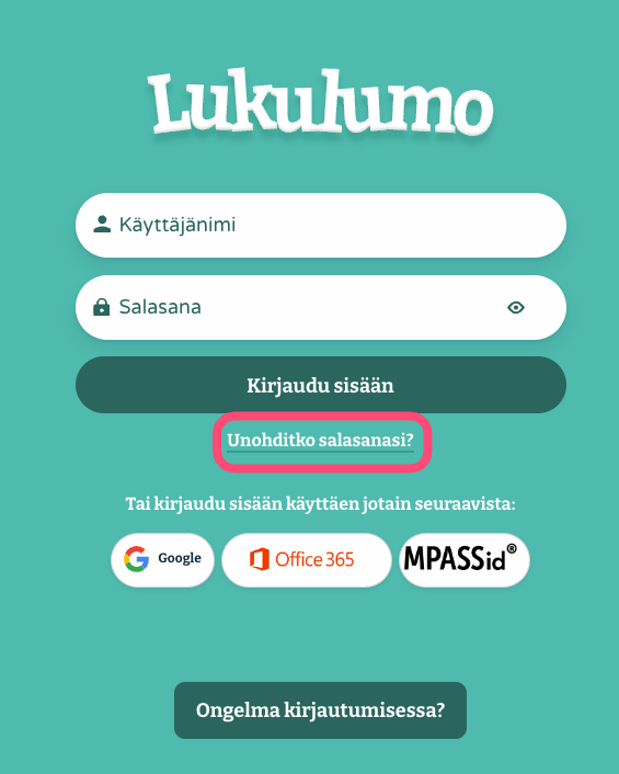 Jos unohdit salasanasi, voit tilata uuden klikkaamalla kirjautumissivulta löytyvää "Unohditko salasanasi?" painiketta. Saat sähköpostiisi linkin, jonka kautta pääset palauttamaan salasanan.