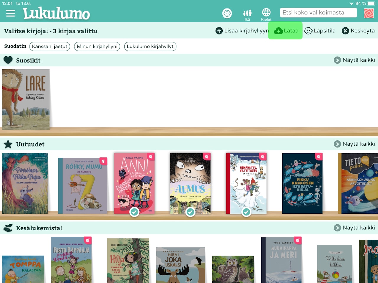 Voit ladata kirjoja sovelluksen kautta laitteelle. Selainversiossa tämä ei ole mahdollista. Kirjan pystyy ladattuna lukemaan Offline-tilassa.