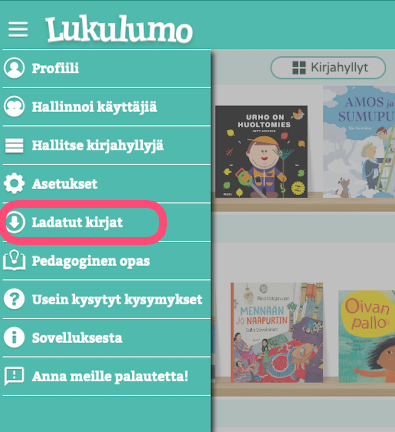 Ladatut kirjat löydät vasemman yläkulman menu -valikon (kolme allekkain olevaa viivaa) alta, kohdasta "Ladatut kirjat".