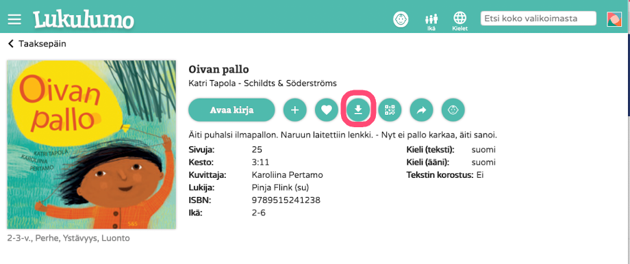 2) Kirjan info-sivulta löydät latauspainikkeen.
